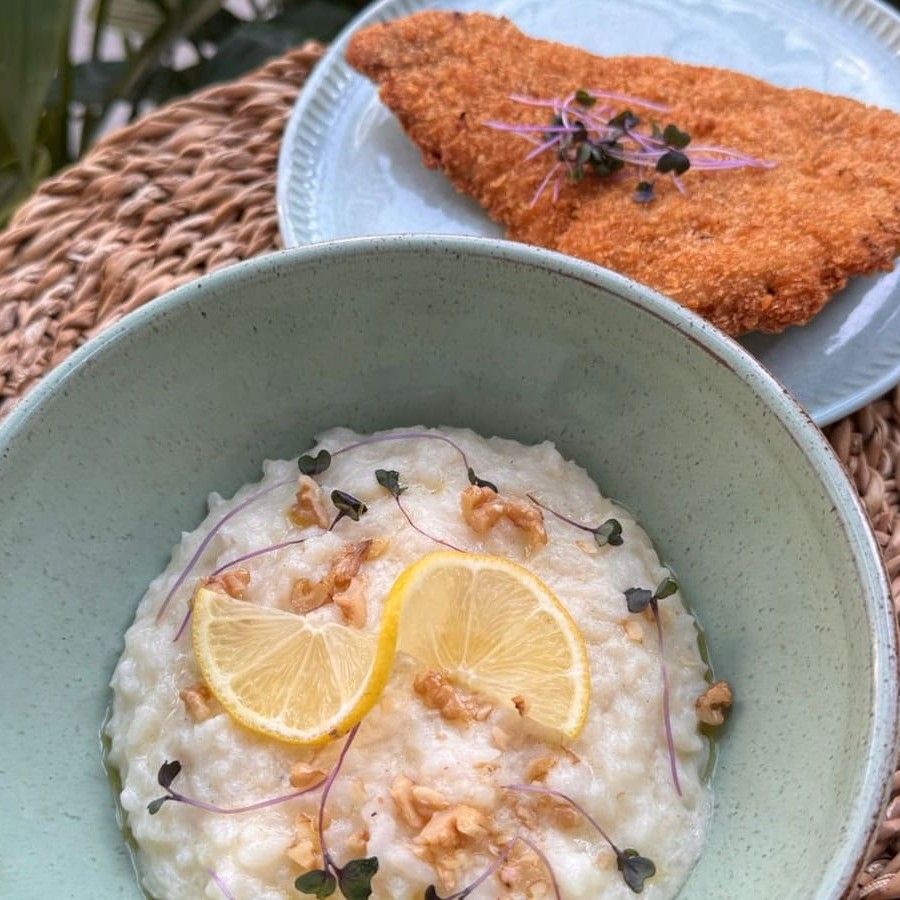 Risoto cremoso de parmesão e limão siciliano, finalizado com nozes. Acompanha: paillard de mignon à milanesa.