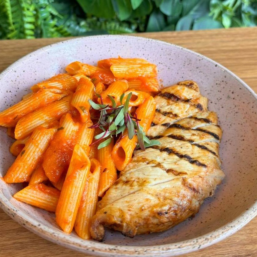 O 'Penne ao Sugo + Frango Grelhado' é uma combinação perfeita que traz o melhor da culinária italiana. O penne, uma massa autêntica italiana, é generosamente envolvido em um molho sugo robusto, preparado cuidadosamente para realçar seu sabor vibrante. Acompanha um frango grelhado suculento, que adiciona uma camada extra de sabor, tornando este prato absolutamente irresistível. Este prato é a opção