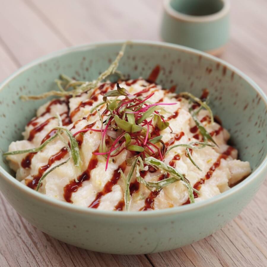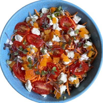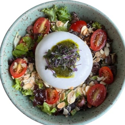 Mix de folhas, burrata artesanal e cremosa, azeitonas pretas, tomate cereja, amêndoas laminadas e molho pesto. Uma combinação deliciosa! *Obs: a burrata virá junto (no mesmo bowl) da salada. Por se tratar de um produto delicado e sensível, ela poderá chegar levemente derretida. Isso não interfere na qualidade do produto.