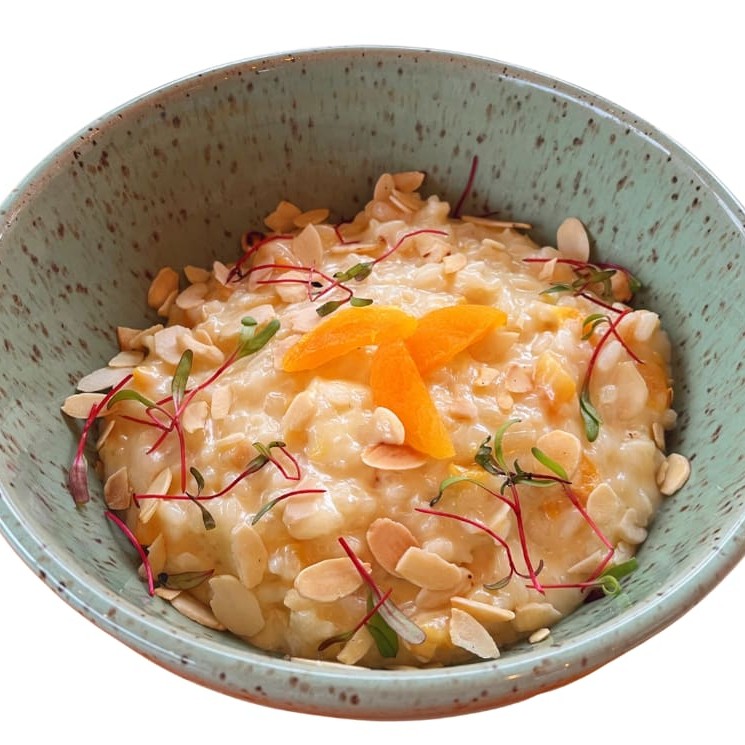 Risoto cremoso feito com arbóreo, parmesão, mozzarella de búfala e damasco, finalizado com amêndoas laminadas. Para ficar ainda melhor, você pode adicionar uma proteína. comida italiana | risoto | risoto de damasco | risoto vegetariano | comida vegetariana | comfort food | queijo | damasco | risotto | risoto de queijos | comida saudável