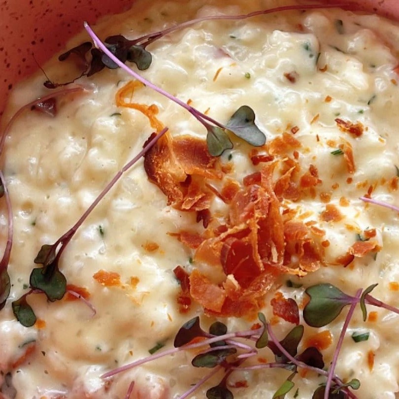 Risoto cremoso feito com arbóreo, parmesão, ovo e bacon. Para ficar ainda melhor, você pode adicionar uma proteína. comida italiana | risoto carbonara | risoto à carbonara | risoto com bacon | comfort food | queijo | carbonara | risotto | bacon comida italiana | risoto | carbonara | risoto caprese | risoto de salmão | risoto de queijo | risoto funghi tartufo | risoto de limão | risoto