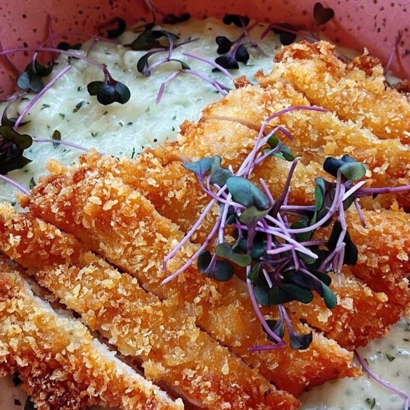 Risoto cremoso feito com arbóreo, parmesão e mix de ervas, acompanhado de frango empanado. comida italiana | risoto | risoto de ervas | risoto com frango empanado | risoto com frango | prato com frango | risotto | frango | comfort food | comida saudável comida italiana | risoto | carbonara | risoto caprese | risoto de salmão | risoto de queijo | risoto funghi tartufo | risoto de lim