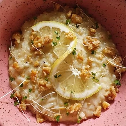 Delicioso risoto cremoso feito de arbóreo, limão siciliano e parmesão. Finalizado com nozes. Uma combinação incrível! Para ficar ainda melhor, adicione uma proteína ao seu risoto. Dica de proteínas para adicionar: falafel, frango empanado ou salmão grelhado. risoto | risoto de limão siciliano | risoto cremoso | risoto com nozes | Malibu Park | vegetariano | veggie | risoto vegetariano Comida sa