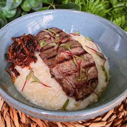 Escalopinhos de *filé mignon (aprox. 130g) com risoto de parmesão e cebola caramelizada. *servido no ponto da casa, não fazemos alteração.