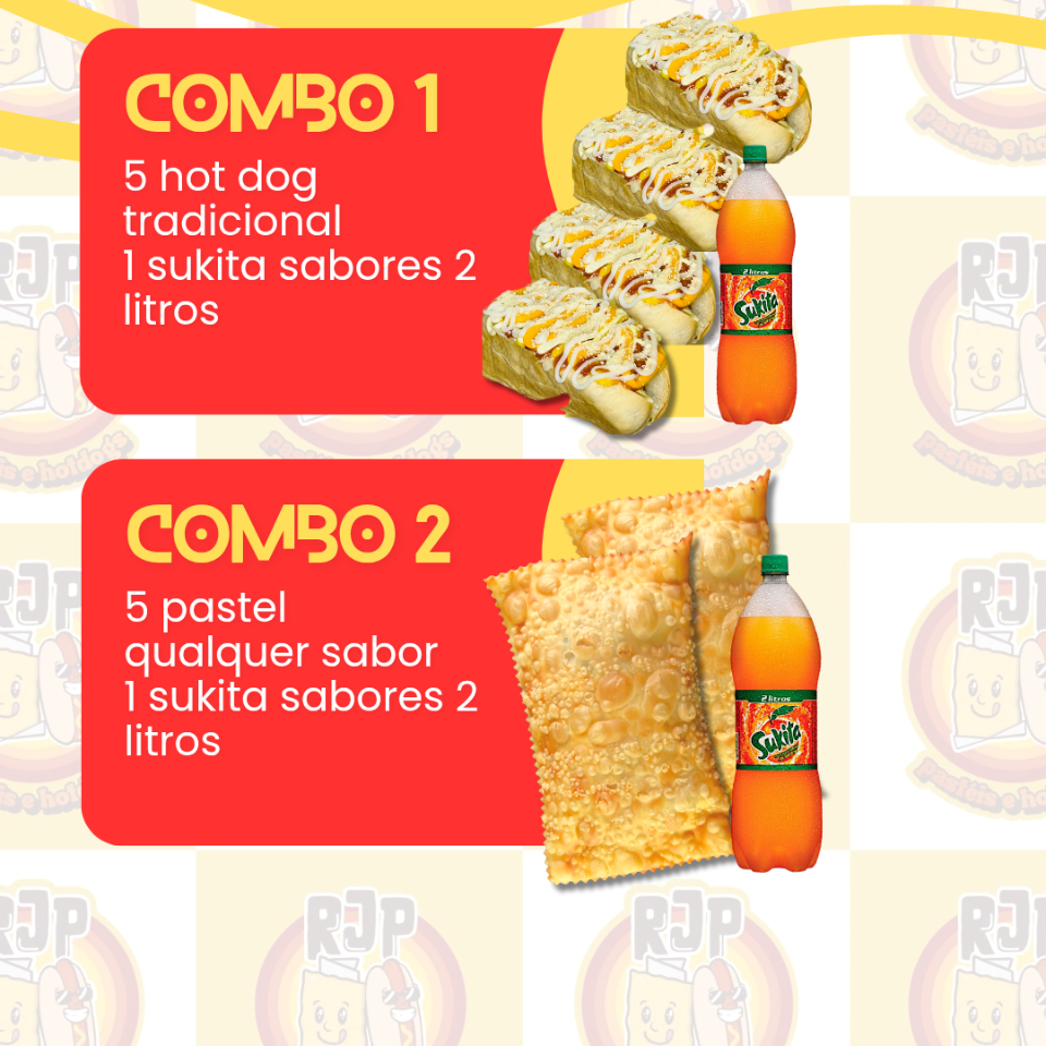 3 hot dog tradicional 3 pastel carne com queijo 1 sukita sabores 2 litros