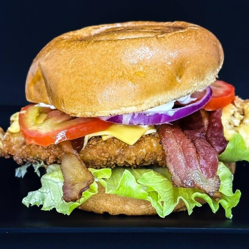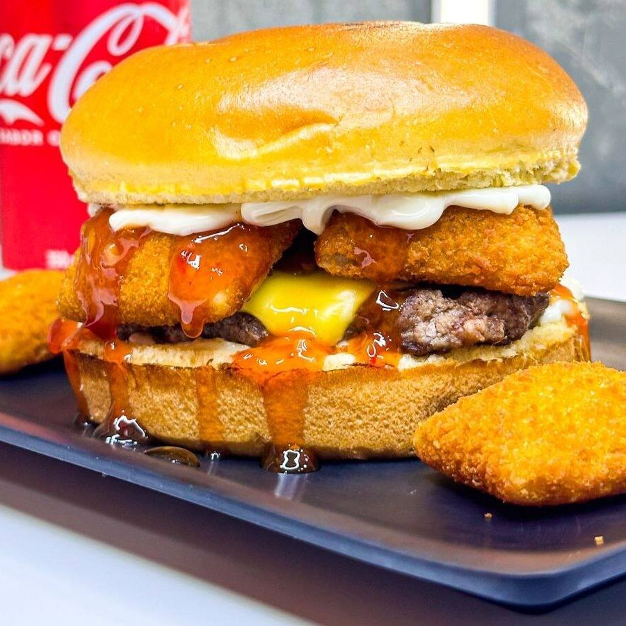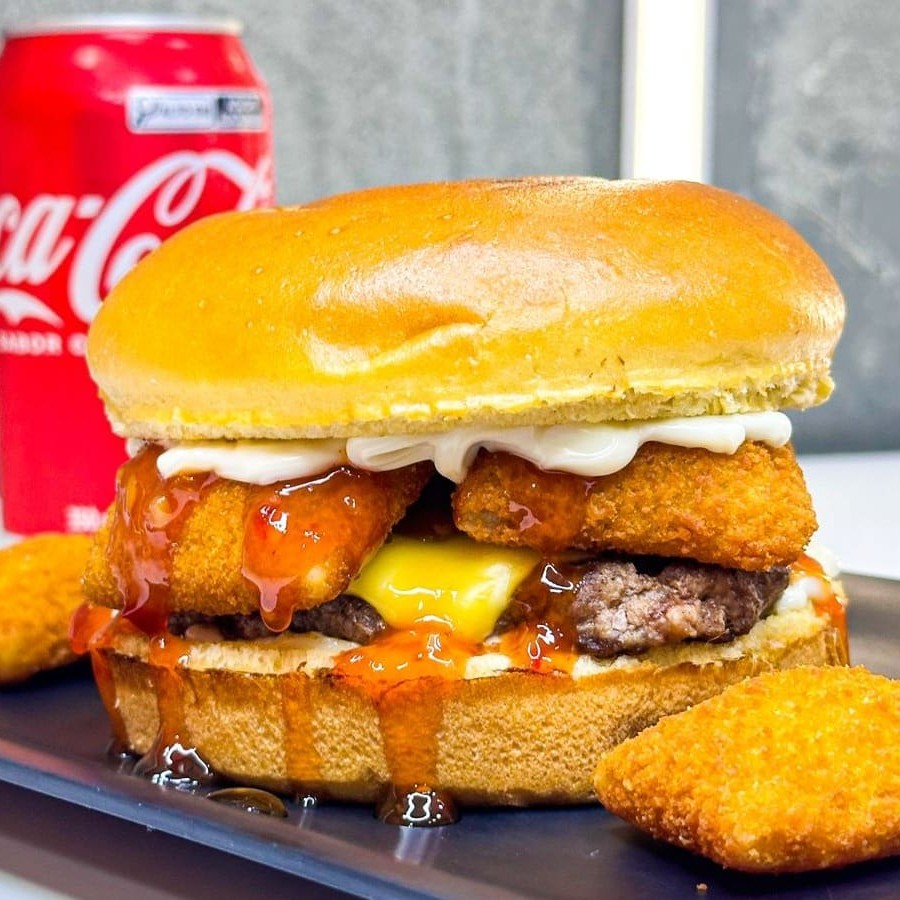Pão, Burger Smash Artesanal, queijo prato fatiado , Crispy de queijo Gouda , Molho Thai Sweet Chili e Maionese Especial.