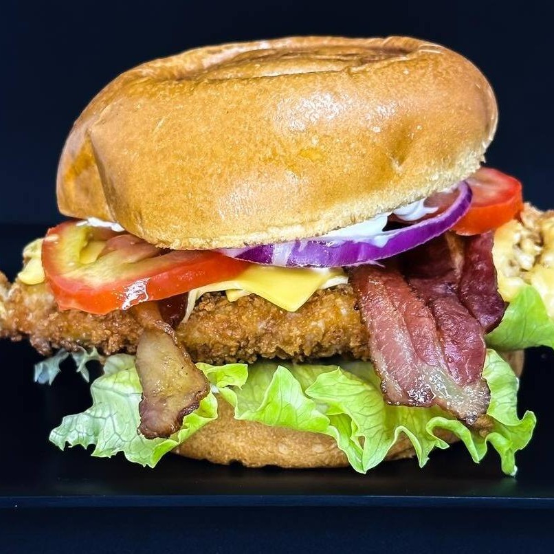 Br Chicken - Pão, frango empanado artesanal, queijo prato fatiado, alface americana, cebola roxa, tomate, tiras de bacon e maionese especial; Batata crinkles com cheddar, bacon e páprica de 200g; Refri de 350ml;