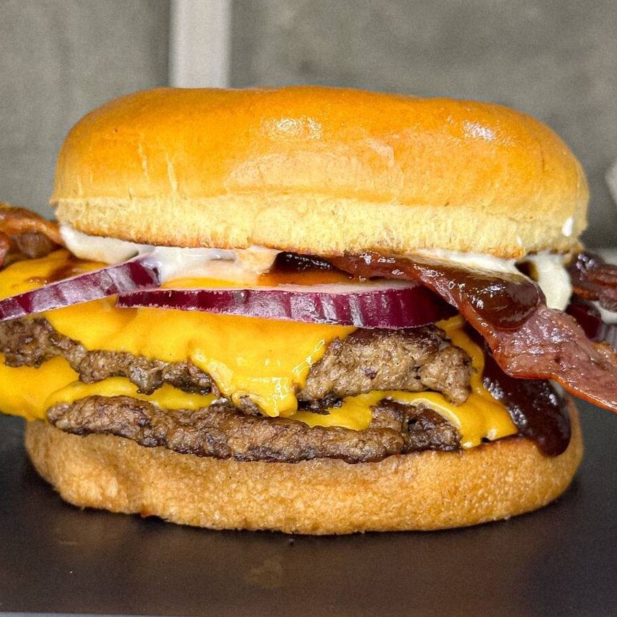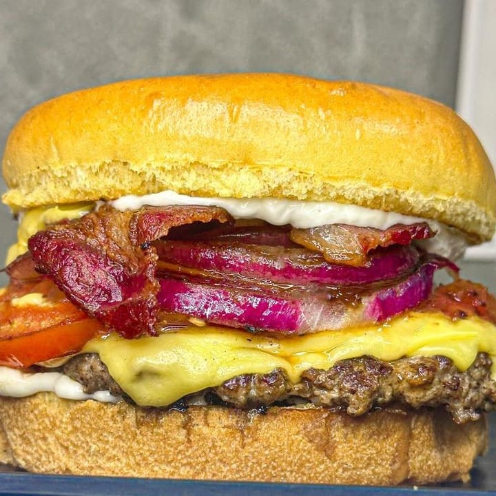 Pão, 2 Burger Smash Artesanal de 110g, Cheddar cremoso, cebola roxa, bacon e Maionese Especial.