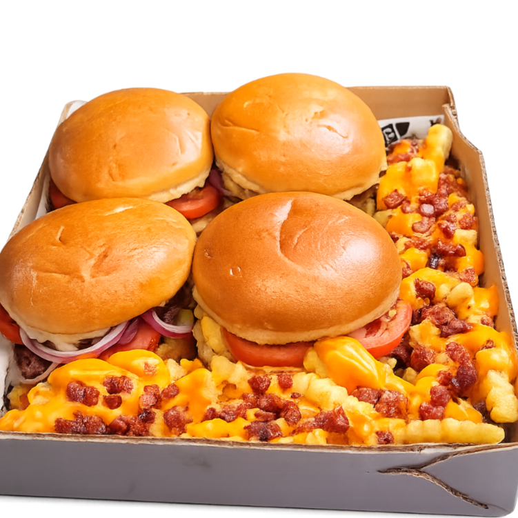 4 x Br Salada - Pão, burger smash de 110 grs, queijo prato fatiado, alface americana, cebola roxa, tomate e maionese especial; + batata cheddar e bacon