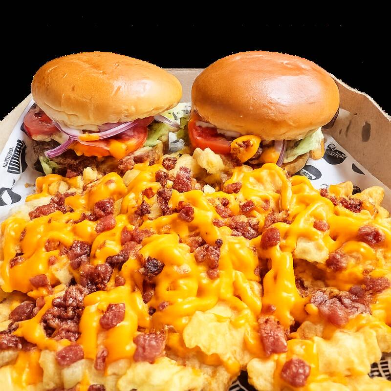 Br Double Cheddar - Pão, 2x burger smash de 110 grs, queijo cheddar fatiado, cheddar cremoso, cebola caramelizada, tiras de bacon e maionese especial; Batata crinkles com cheddar, bacon e páprica de 200g; Refri de 350ml;