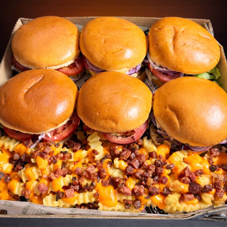6x Br Salada - Pão, burger smash de 110 grs, queijo prato fatiado, alface americana, cebola roxa, tomate e maionese especial; + batata cheddar e bacon