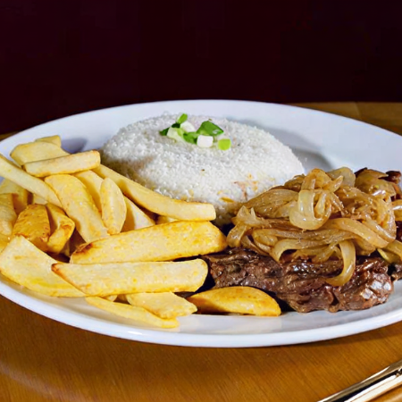 Baby Beef grelhado, coberto com cebola grelhada. Acompanhado de arroz, feijão, farofa e nossa exclusiva batata Chips!