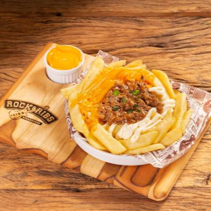 Batatas fritas cobertas com costelinha suína desfiada ao molho Barbecue, cheddar e requeijão cremoso. Acompanha molho chipotle.
