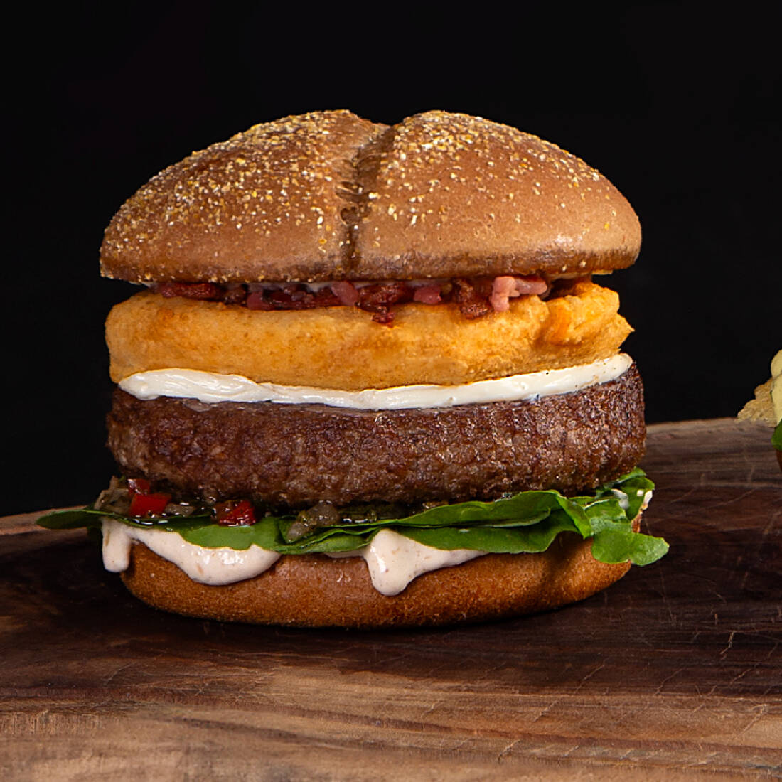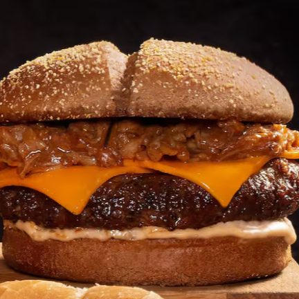 Hambúrguer de carne bovina grelhado coberto com costelinha suína desfiada ao molho Barbecue Ranch. Servido no pão de hambúrguer australiano.