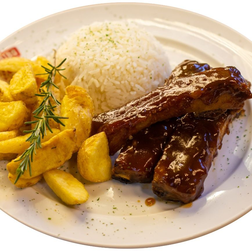 3 Tiras de costela suína regadas ao molho Barbecue. Acompanhado de arroz, feijão, farofa e nossa exclusiva batata Chips!