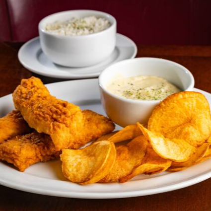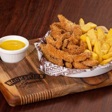 Tiras de tilápia empanadas em farinha crocante com parmesão e Lemon Pepper, servidas com batatas fritas. Acompanha molho Ranch.