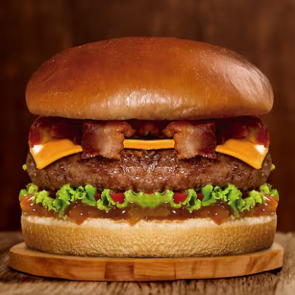 Hambúrguer de carne bovina grelhado, alface, tomate, bacon, queijo cheddar e Smoked Sauce. Servido no pão brioche. Acompanha batatas Chips e uma bebida. Escolha a seguir.