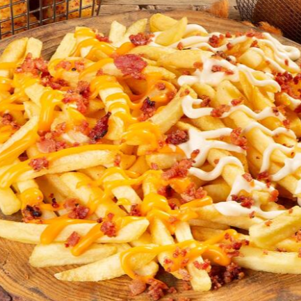 Porção de batatas fritas cobertas com cheddar cremoso, requeijão, parmesão e bacon. Acompanha molho Ranch.