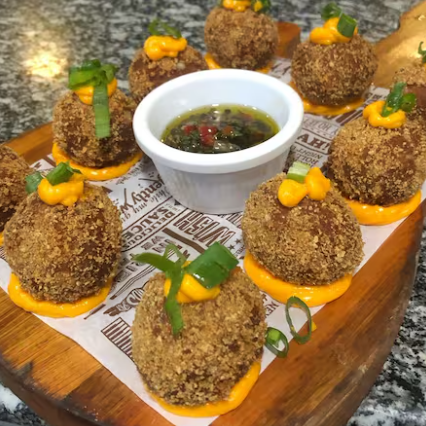 Bolinho de pernil desfiado com parmesão, requeijão e muçarela, crocante por fora e cremoso por dentro.