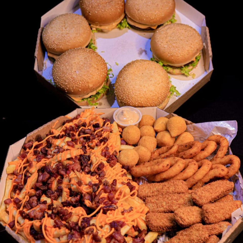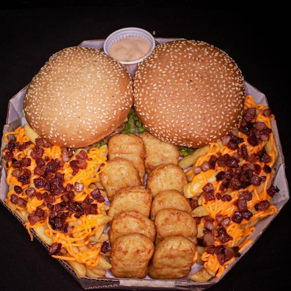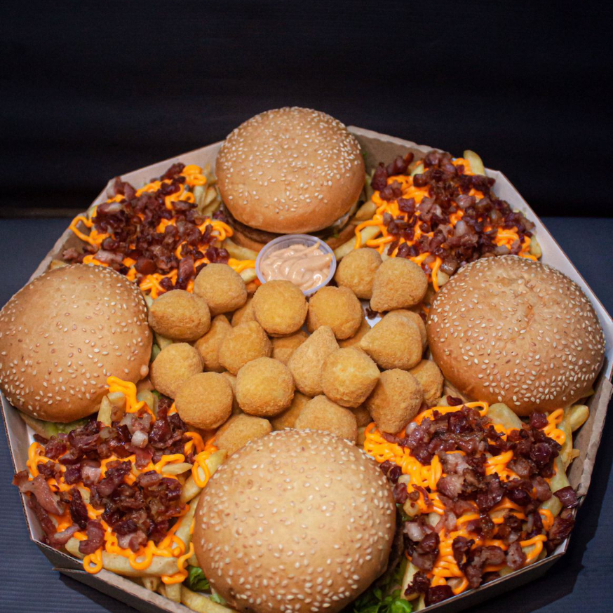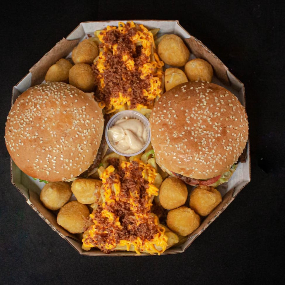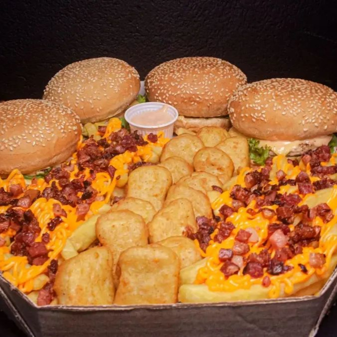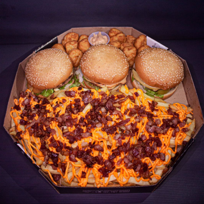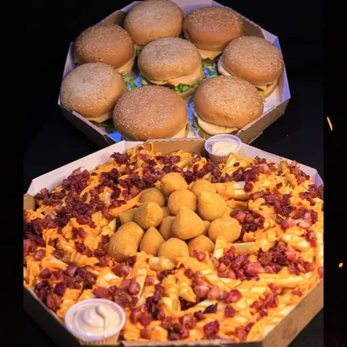 1 lanche da sua escolha, carne da sua escolha, 250g fritas cheddar e bacon, 5 coxinhas, 5 nuggets, 5 onion rings e copo de maionese da casa