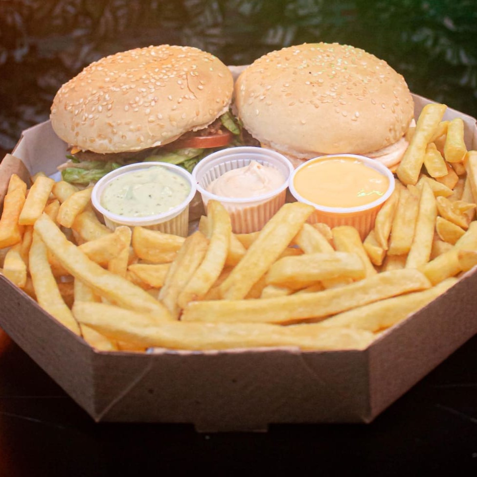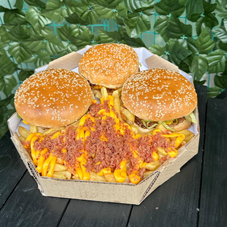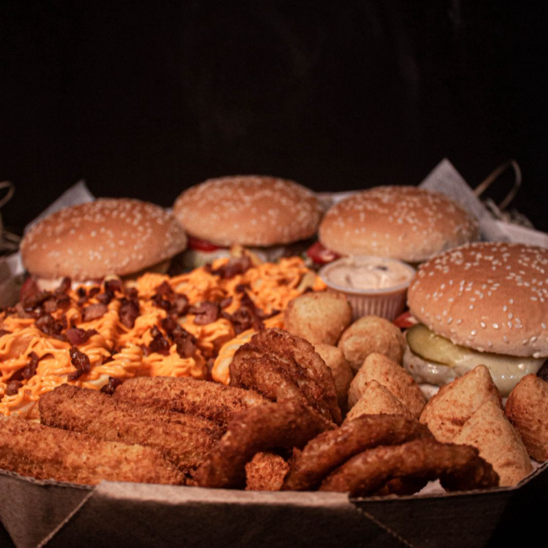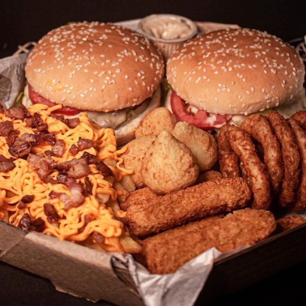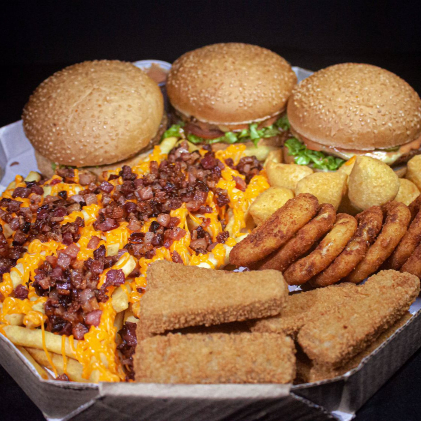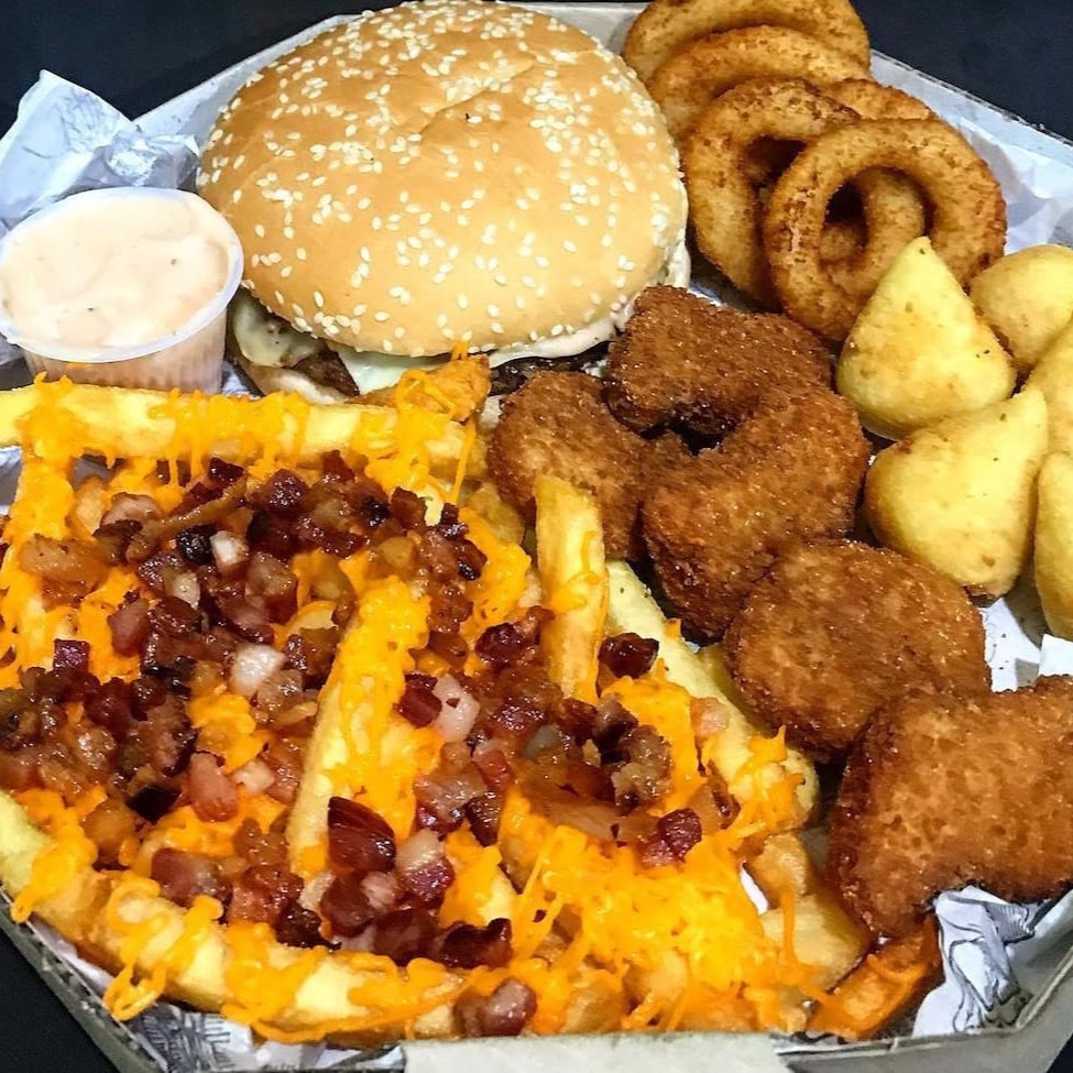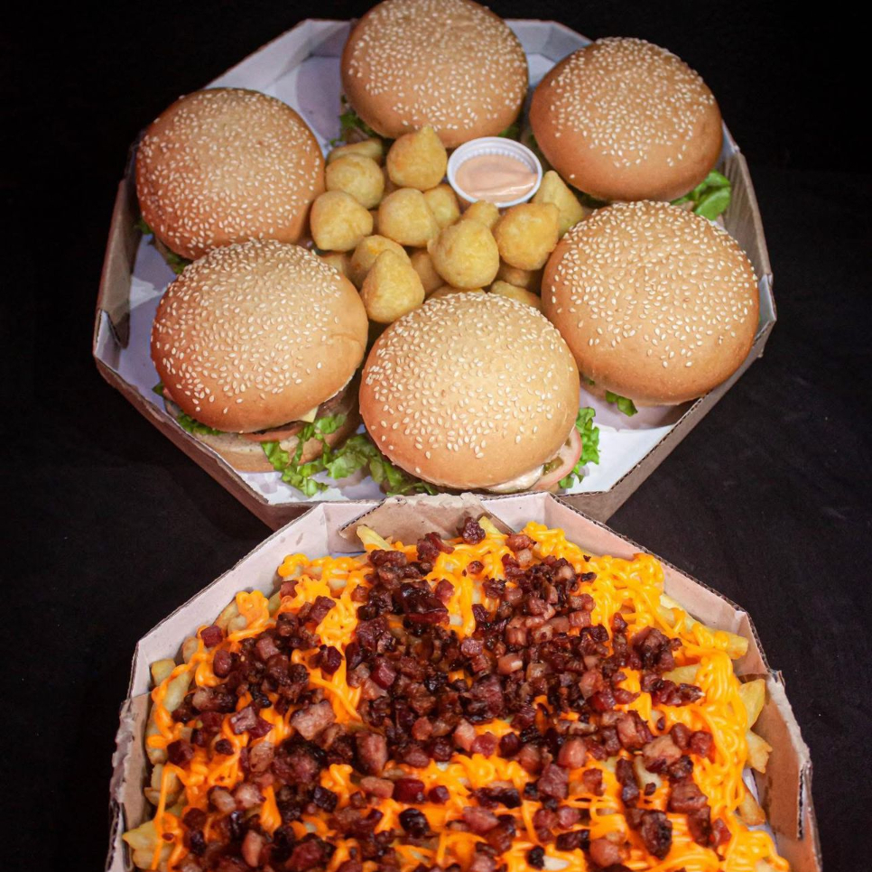 1 lanche da sua escolha, carne da sua escolha, 250g fritas cheddar e bacon, 5 coxinhas, 5 nuggets, 5 onion rings e copo de maionese da casa