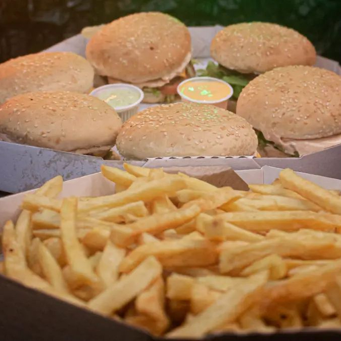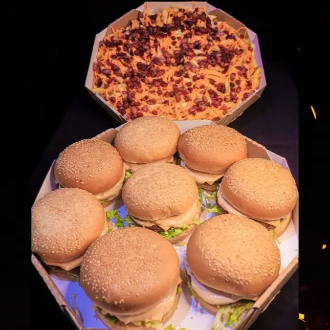 8 lanches da sua escolha sendo industrializado de boa qualidade e artesanal 100% angus carne fresca todos os dias nada de congelar ! todos os lanches vao com maionese artesanal da casa ! porcao de fritas 700g cheddar e bacon 15 coxinhas 15 Nuggets de frango 15 oinion rings ( cebola empanada ) 2 copos de maionese artesanal da casa