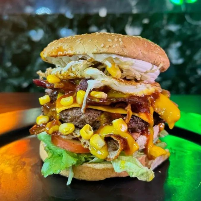 Escolhido por vocês clientes na votação do instagram ! pão corte duplo geergilim bem fofinho blend artesanal angus 150g alface americana tomate queijo mussarela presunto ovo queijo cheddar milho bacon ketchup mostarda e muita maionese defumada aquela com sabor de churras verdadeiro monstro !