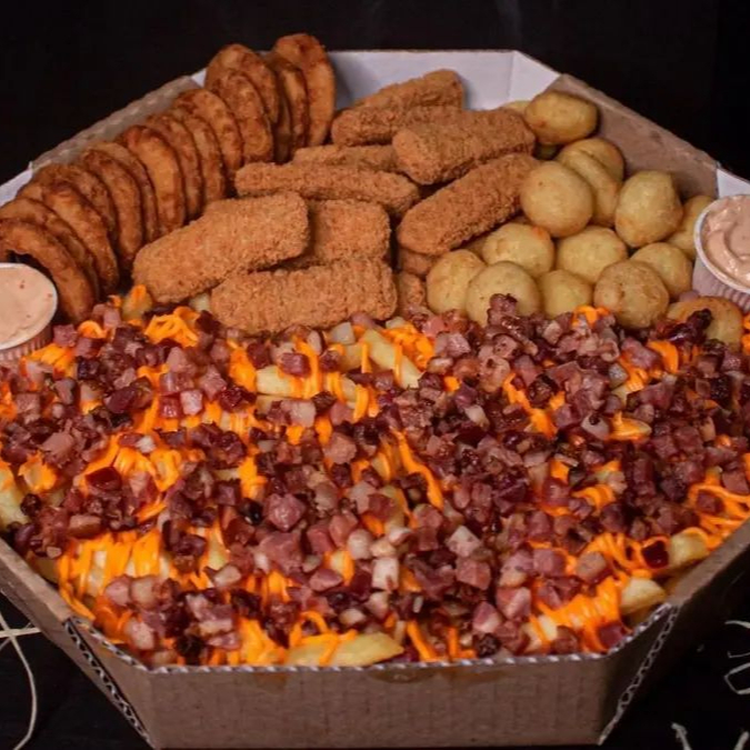 Porção do chef com 4 acompanhamentos , fritas com cheddar, bacon, coxinhas, onion rings e nuggets de frango