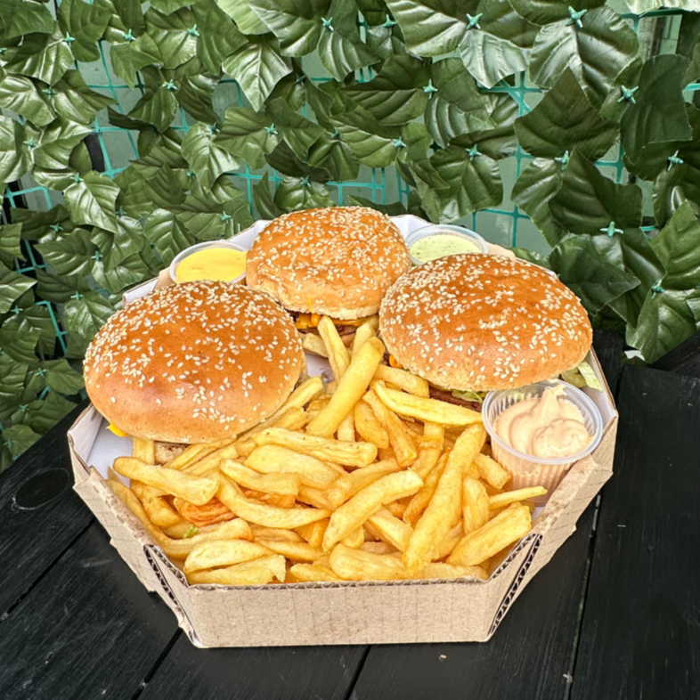 3 lanches da sua escolha sendo industrializado ou artesanal 100% angus 500gr fritas só sal 3 copos de molhos da casa jantar , combo pra 3
