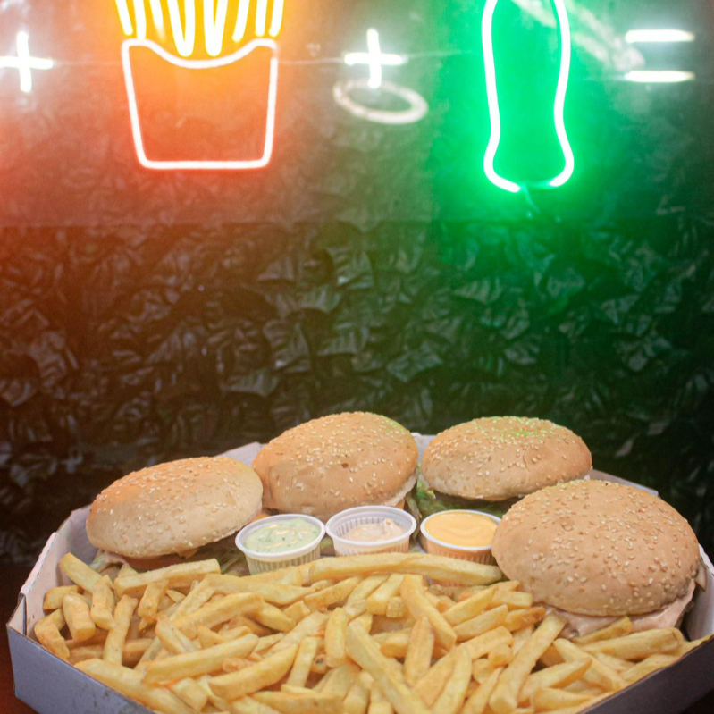 4 lanches da sua escolha, sendo industrializado de ótima qualidade e artesanal 100% angus nem se fala carne fresca todos os dias nada de congelar picles maionese especial da casa 500g fritas só sal 3 copos molhos da casa pizza, janta, combo pra 4