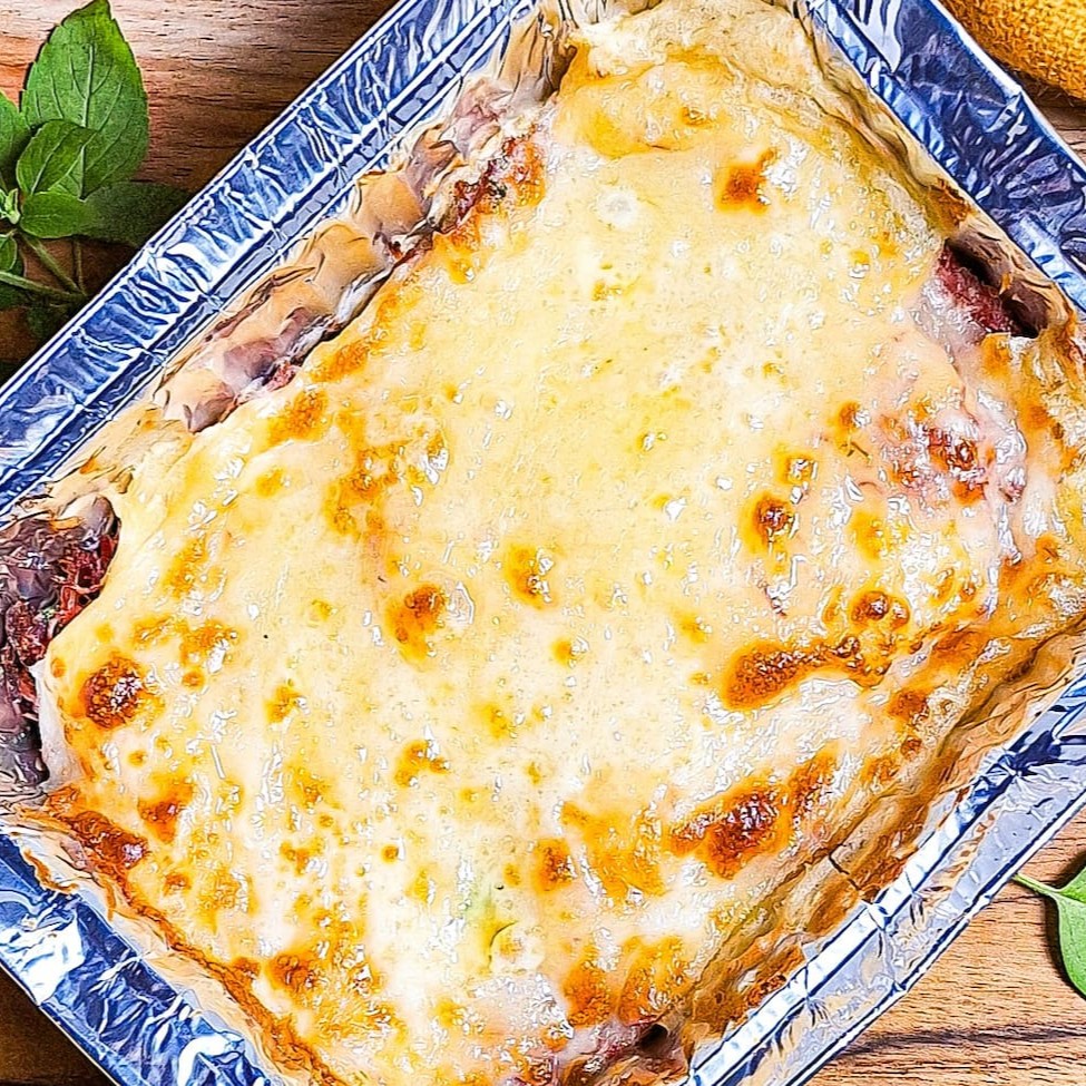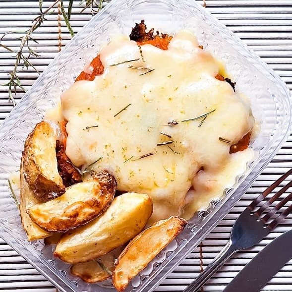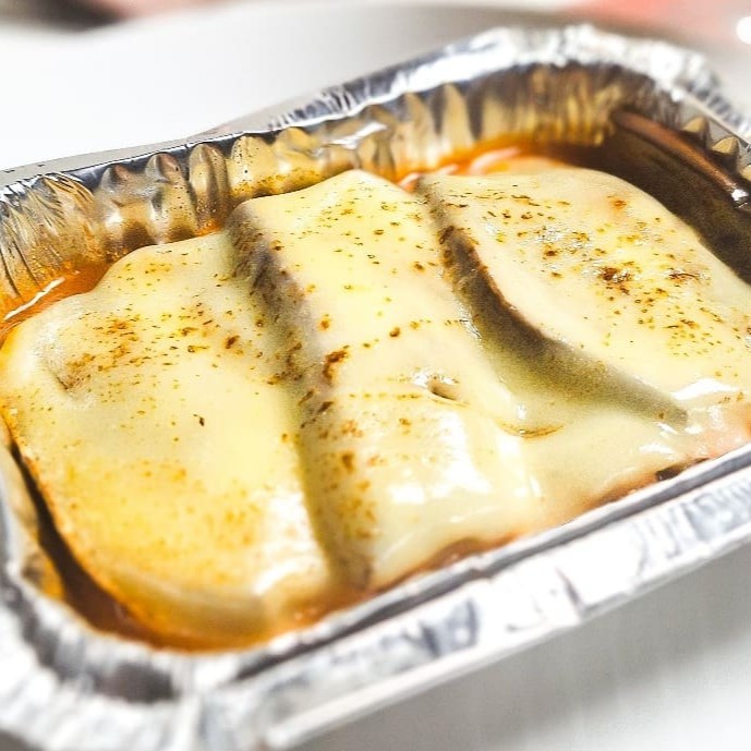 150g de berinjela fatiada, 100g de molho à bolonhesa feito com molho caseiro de tomates assados e com uma camada de 50g de queijo derretido.