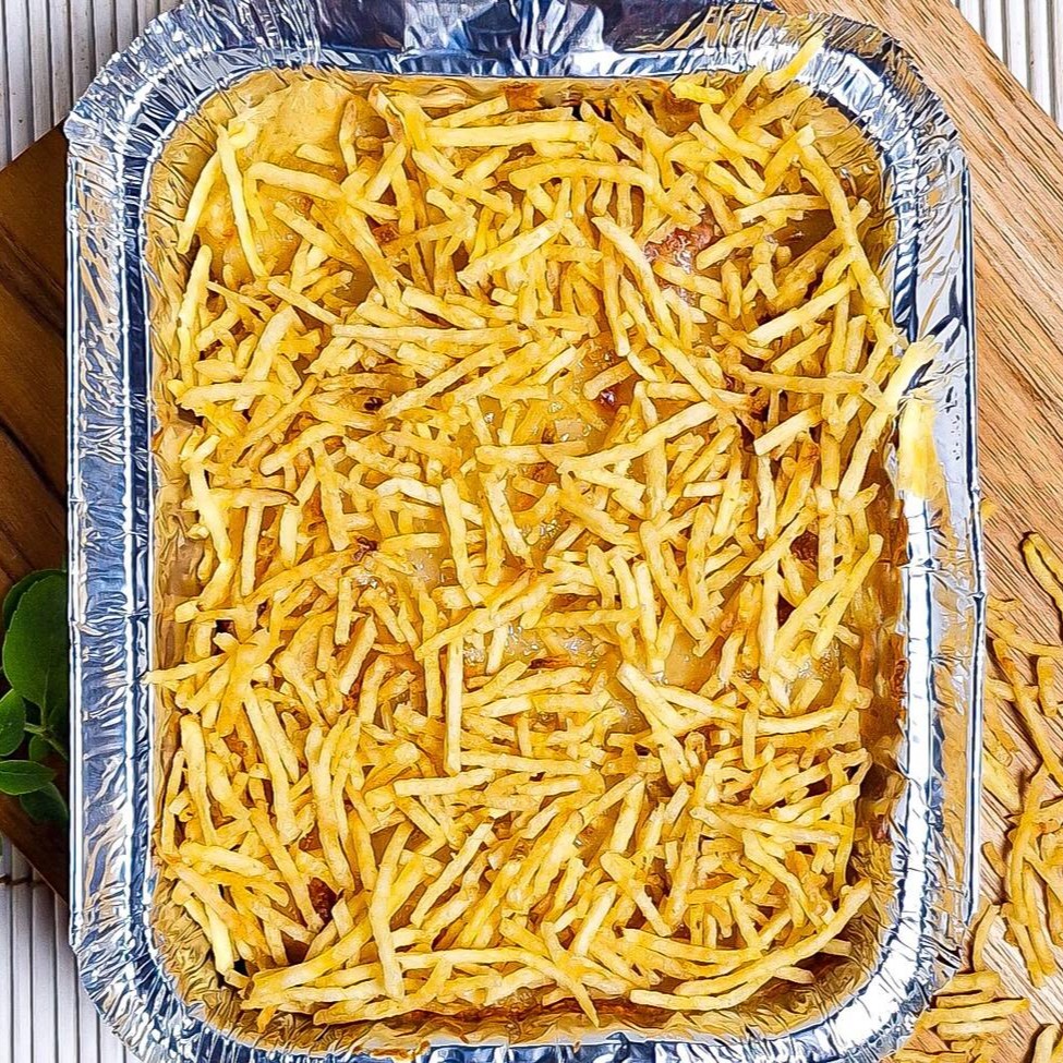 200g de purê cremoso de mandioca com 100g de carne seca desfiada finalizado com uma camada de queijo mussarela.