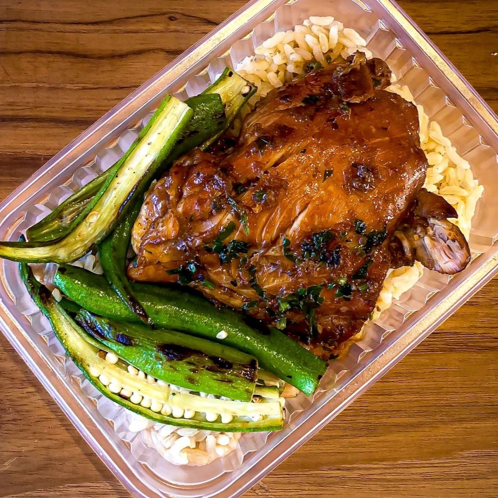 Suculenta sobrecoxa, pesando aproximadamente 100g, envolvida em temperos caseiros que realçam seu sabor. Acompanha 50g de quiabo, cuidadosamente grelhados. Para completar, 150g de arroz integral e 100g de feijão. Serve bem 1 pessoa