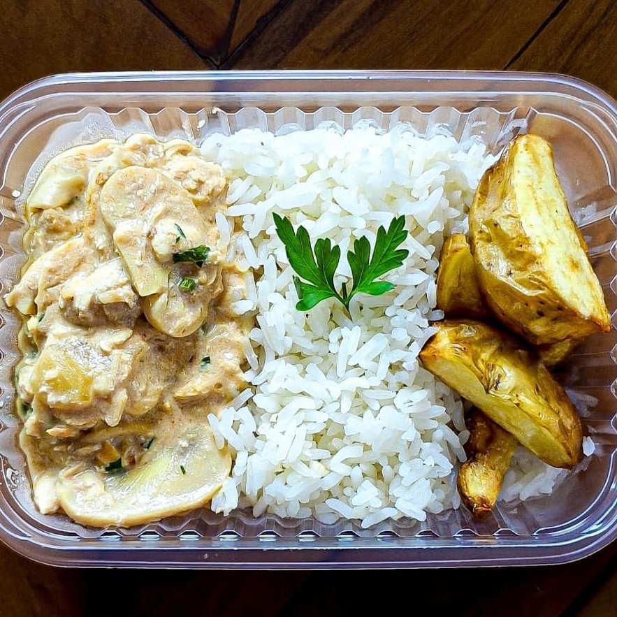 120g de strogonoff de frango cremoso, preparado com tiras macias de peito de frango, 130g de arroz branco soltinho e 50g batatas rústicas douradas, temperadas com alecrim.