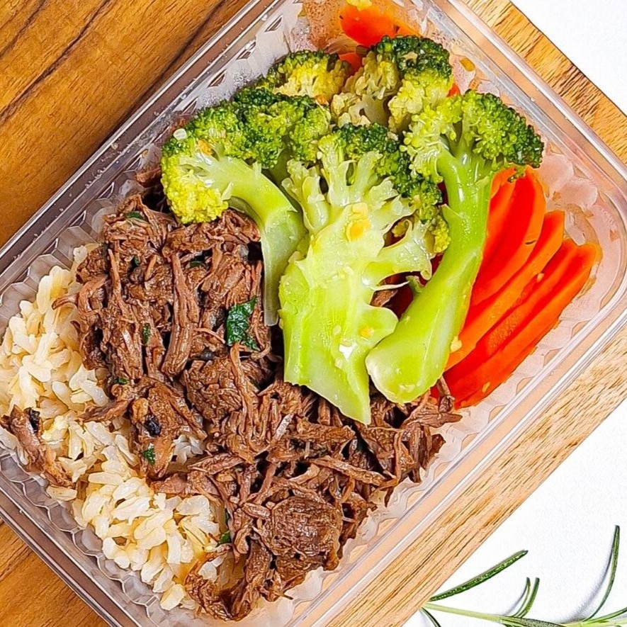 Deliciosa carne de coxão mole cozida e desfiada, pesando 100g. Acompanha 100g de arroz integral, leve e saboroso, e 100g de mix de legumes. Nossas marmitas são congeladas, feitas com temperos naturais e ingredientes selecionados. Aquecer no micro-ondas por 5 a 7 minutos, mantendo sabor, aroma e textura.