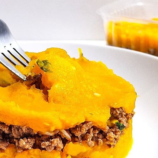 200g de purê de abóbora cremoso, 100g de carne moída bem temperadinha. (sem lactose e sem glúten)