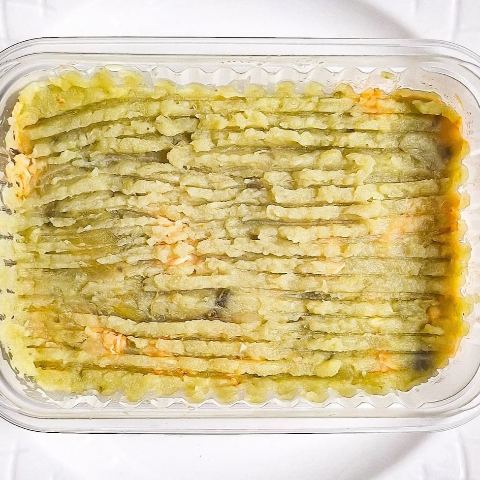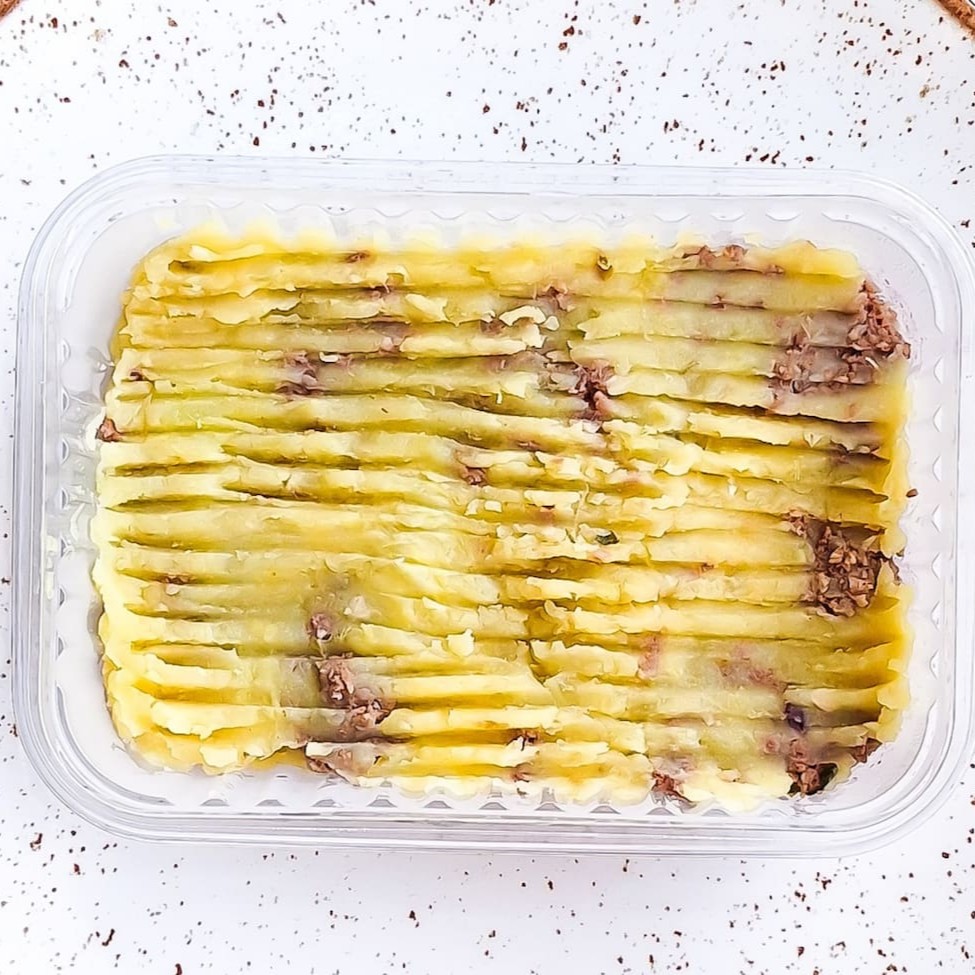 200g de purê de batata doce cremoso, 100g de carne moída temperada.