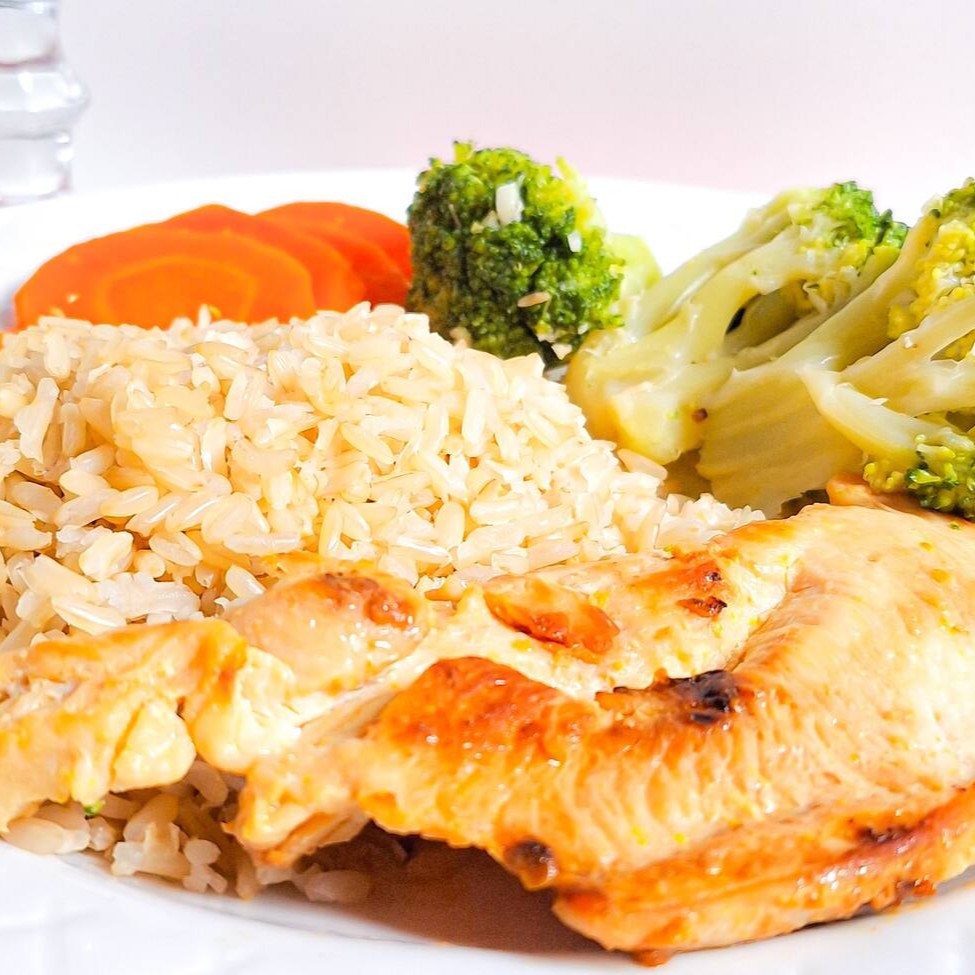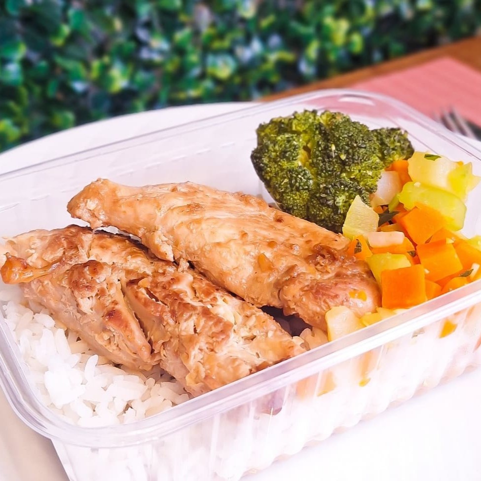 Com 100g de suculento e saboroso filezinho de frango grelhado acompanhado com 100g de arroz integral e 100g de mix de legumes.
