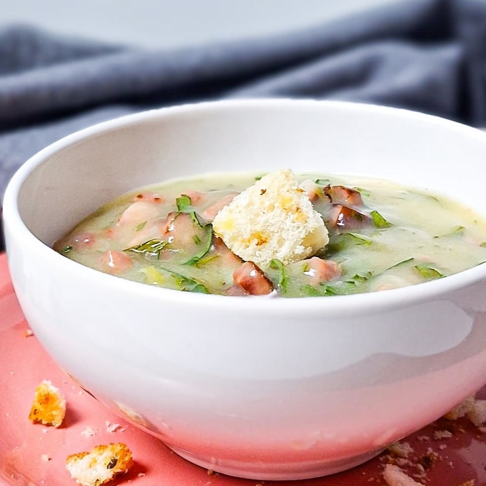 Caldo verde cremoso feito com batatas e couve na manteiga com linguicinha.
