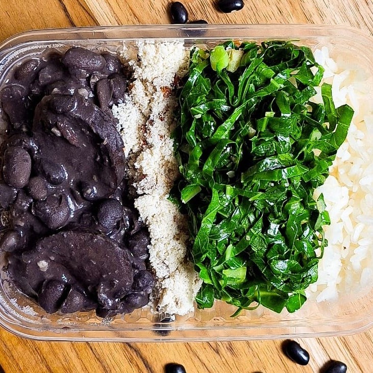 Deliciosa Feijoada Light com 200g de Feijão com linguiça calabresa, charque suíno e bovino, 130g arroz branco, 40g de couve e 30de farofa de bacon. Serve bem 1 pessoa