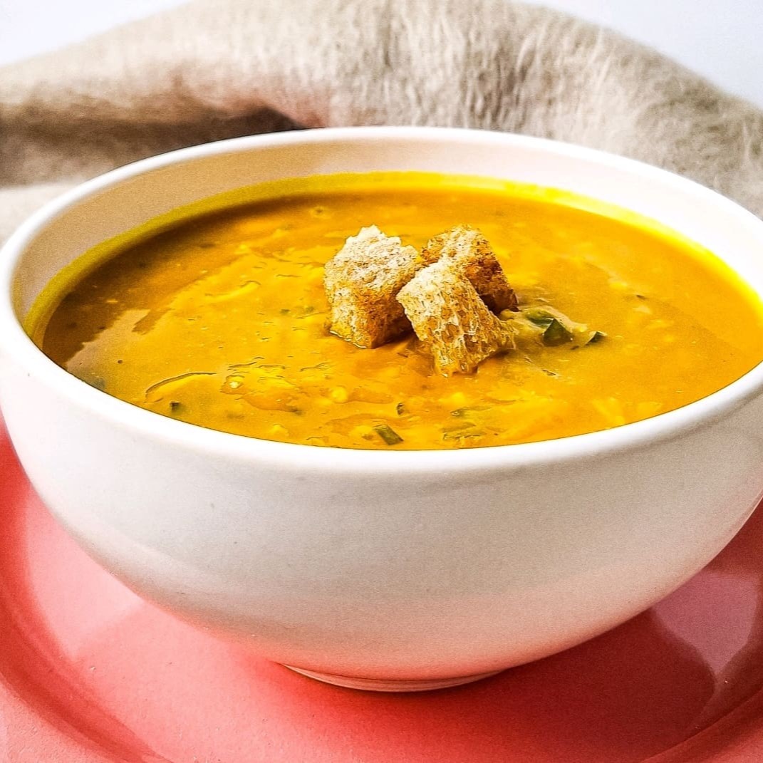 Caldo de abóbora cozido lentamente com frango desfiado.