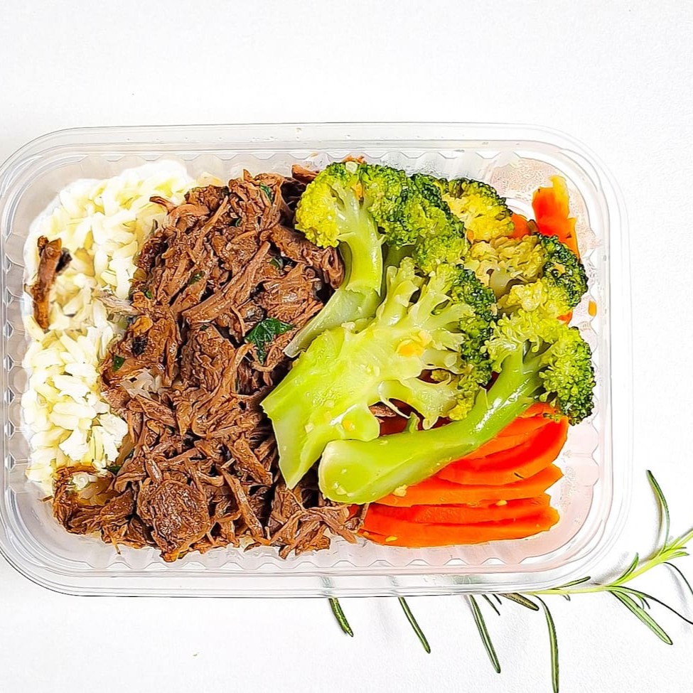 Deliciosa carne de coxão mole cozida e desfiada, pesando 100g. Acompanha 100g de arroz branco e 100g de mix de legumes.