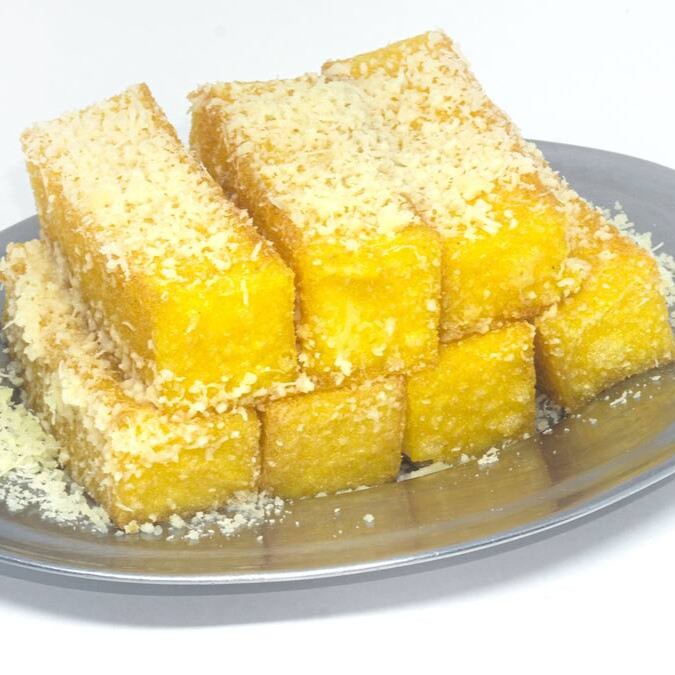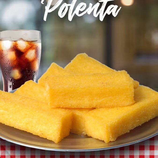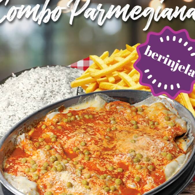 Berinjela à milanesa, coberto com molho ao sugo, queijo mozzarella, parmesão e ervilha. Acompanha polenta ou farofa.
