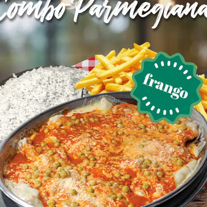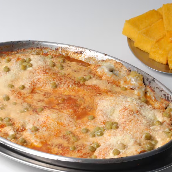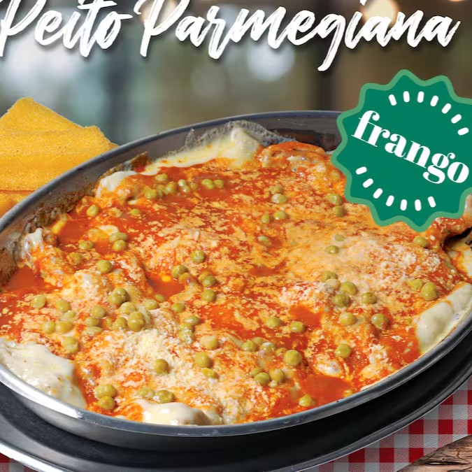 Peito de frango à milanesa, coberto com molho ao sugo, queijo mozzarella, parmesão e ervilha. Acompanha polenta ou farofa.
