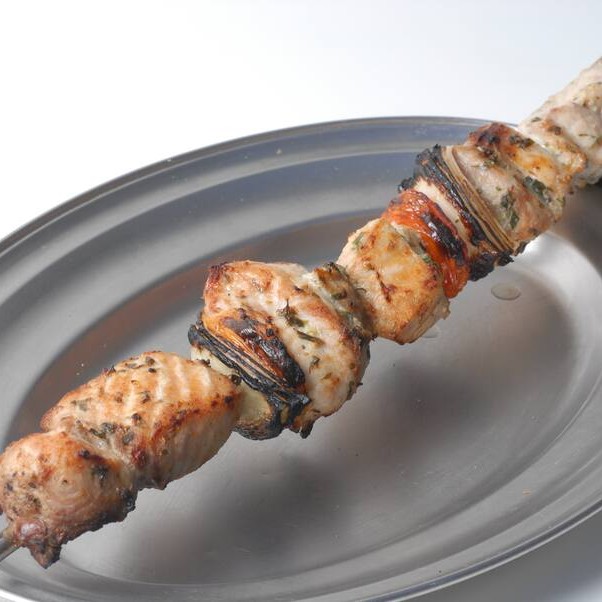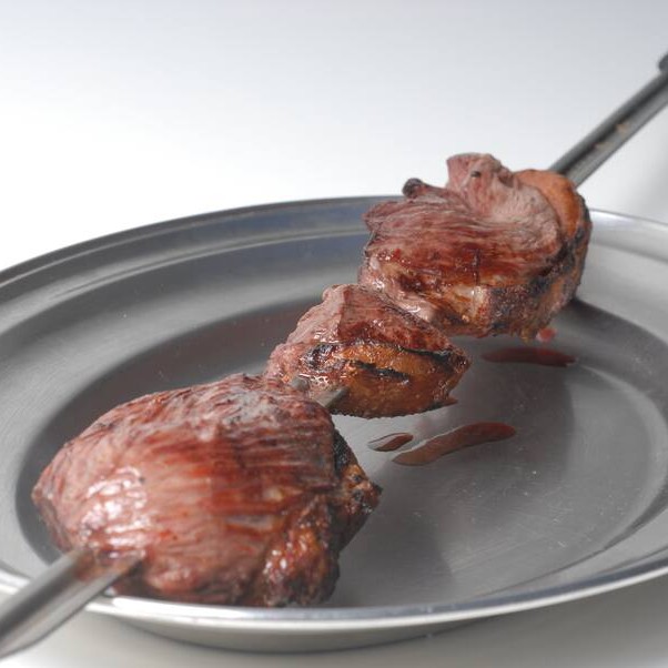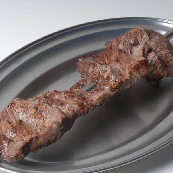 Porção individual do espeto "mixto" que é composto de filet mignon,lombo suíno e linguiça de pernil intercalados com fatia de bacon,tomate e cebola.Escolha 3 guarnições