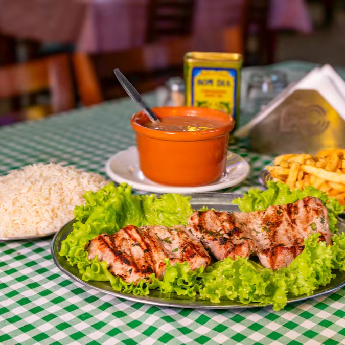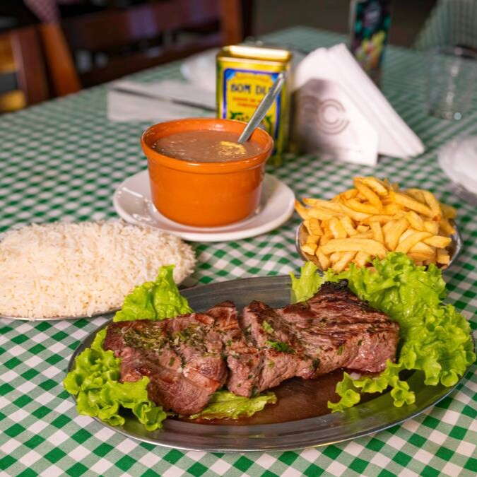 Saboroso e requintado, o nosso 'Filet Mignon Completo' é a escolha perfeita para os apreciadores de um bom churrasco. O suculento filet mignon, conhecido por sua maciez inigualável, é o protagonista deste prato. Acompanha arroz branco, levemente soltinho, feijão carioca robustamente temperado e batatas fritas crocantes, douradas à perfeição. Ideal para compartilhar momentos especiais, este prato serve de 2 pessoas. Uma experiência gastronômica enriquecedora que combina a tradição do churrasco com a sofisticação do filet mignon.