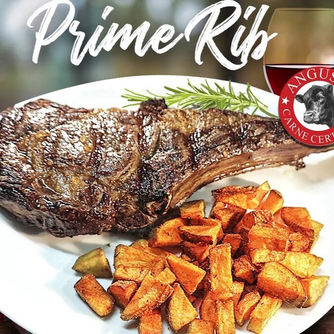 Prime Rib grelhado em churrasqueira guarnecido com batatas brava,(fritas com casca e salpicados com um mix de tempero da casa.