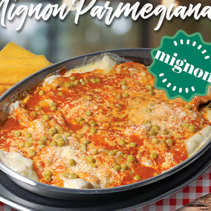 Filet Mignon à milanesa, coberto com molho ao sugo, queijo mozzarella, parmesão e ervilha. Acompanha polenta ou farofa.