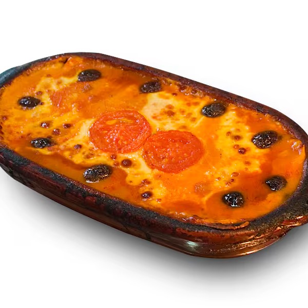 Massa fresca, intercalada com molho ao sugo, presunto, molho branco e queijo mozzarella, decorada com rodelas de tomate e azeitonas pretas.