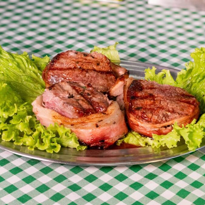 Três postas do nobre corte do miolo do filet mignon,"abraçados" por deliciosas fatias de bacon defumado. Acompanha polenta ou farofa.